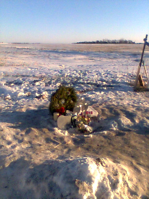 That morning it was sunny and 15 degrees below zero plus wind chill. The crash site is in the middle of a field. Snow was plowed into three-foot-high embankments on both sides of the road. There is a tell-tale path along a fence row, with snow crushed down by visitors. The gate to the crash site is shaped like horn-rimmed glasses.