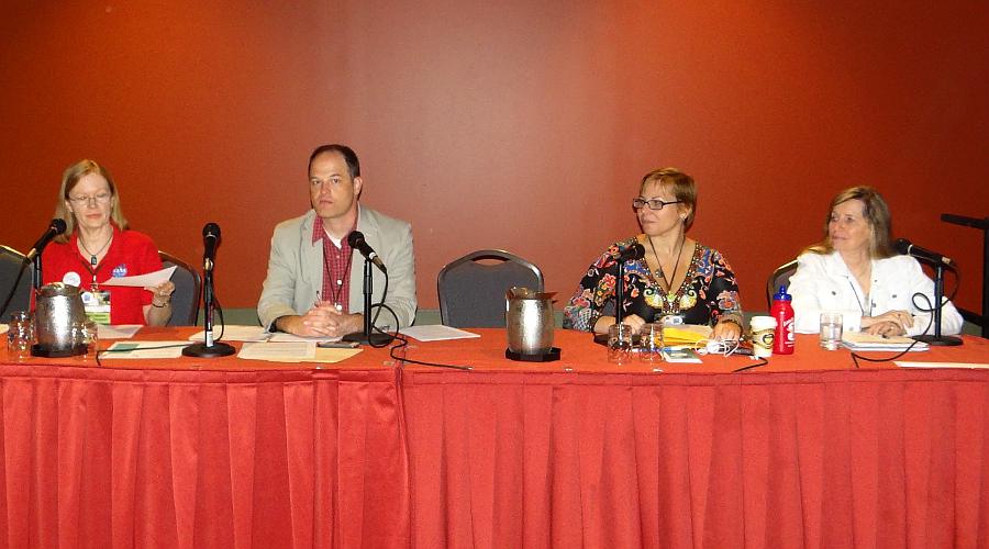 Here’s a photo from Keith Stokes’ photo site of the AboutSF Teaching Workshop. That’s Marianne Dyson, me, Mackenzie VanBeest, and Val Ontell (L to R).