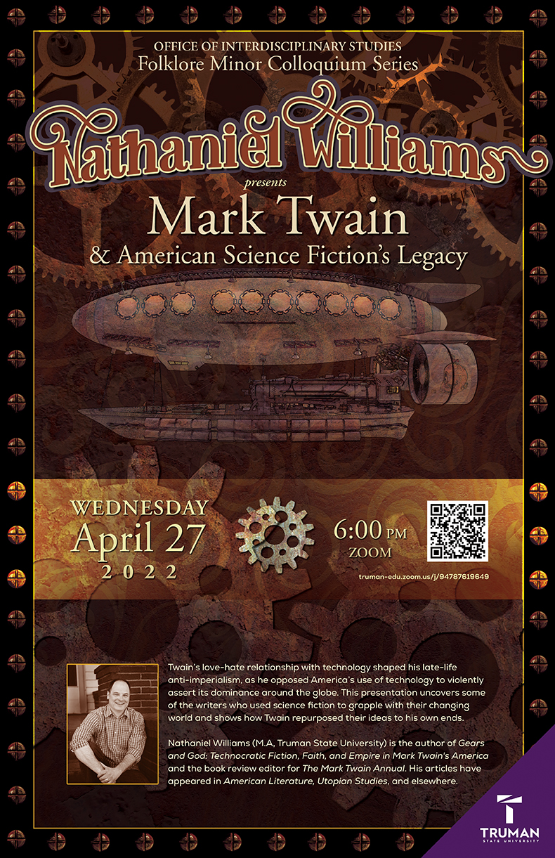 At the end of this month, I’ll be giving a Zoom lecture called “Mark Twain and American Science Fiction’s Legacy” at part of Truman State University’s Folklore Minor Colloquium Series.